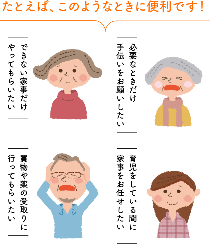 高齢化社会が進み、だんだんとお年寄りの一人暮らしや老老介護の世帯が増えてきた中、料理や買物、掃除など、生活のちょっとした場面で困っている話をよく耳にします。そのような方々へ、短時間だけ、必要なことだけをお助けし、少しでも生活の支援ができないかと考え、スタートさせました。