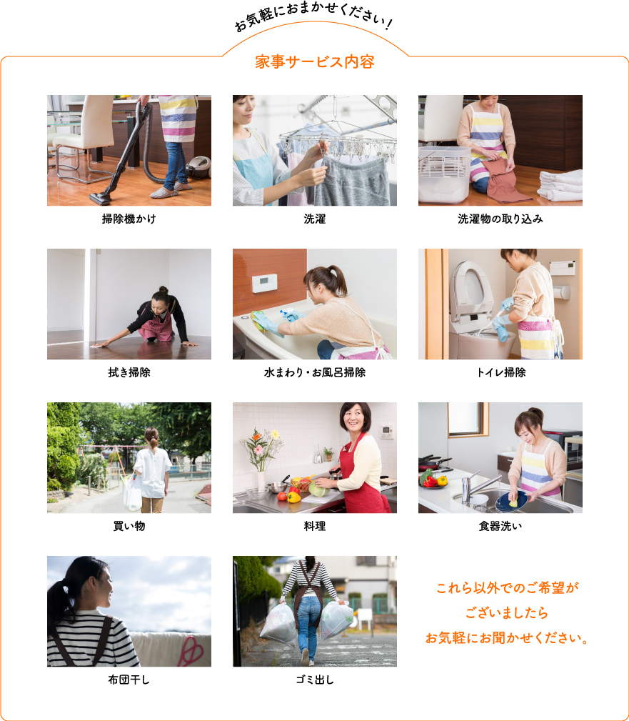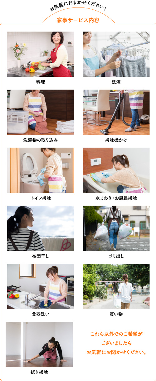 料理、掃除、洗濯、買物などなどさまざまな家事をお受けします。鍵のお預かりによる、留守中の対応も可能です(*初回お試しプランの場合は除きます)。